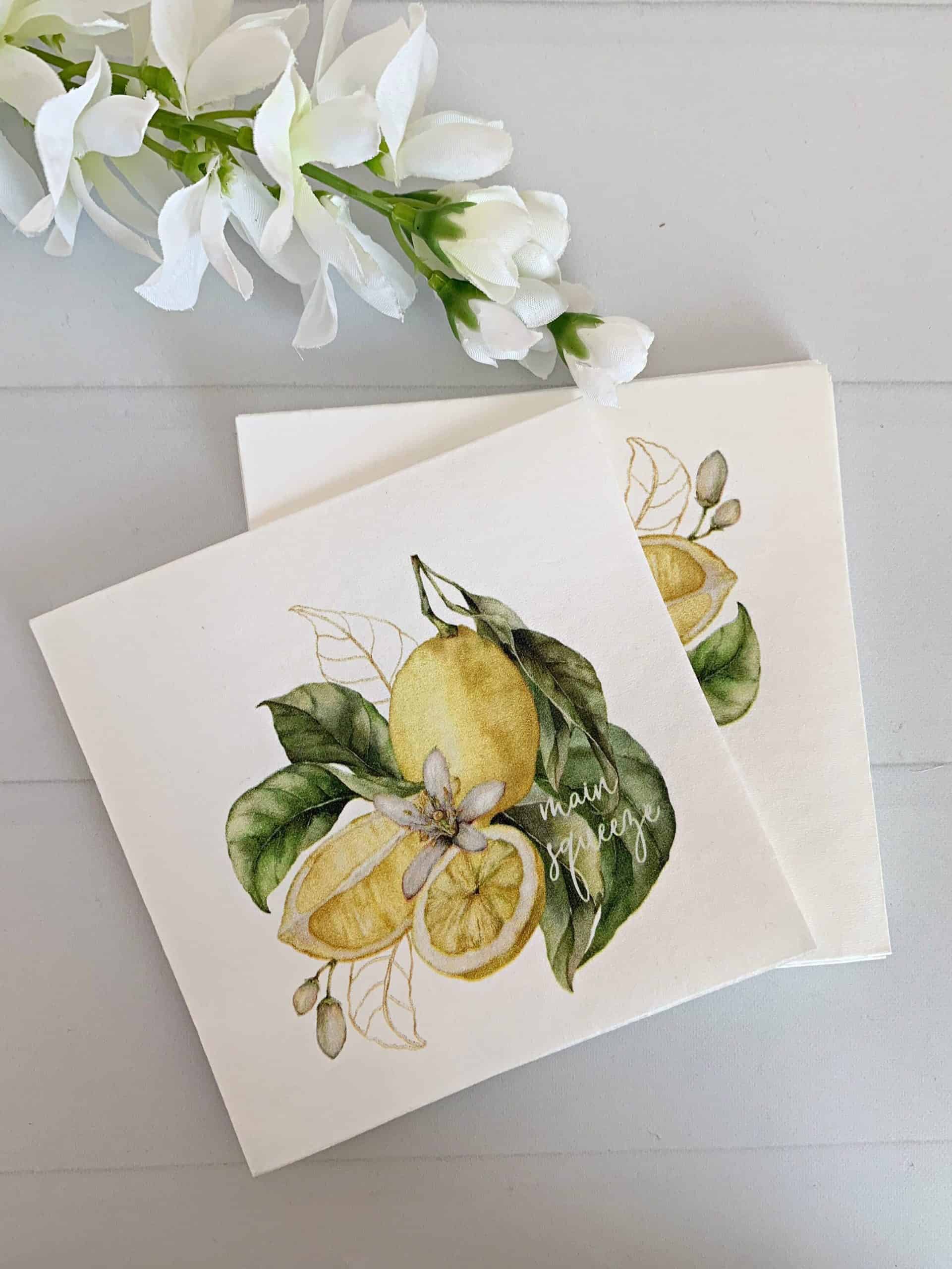 Celebrate that the bride to be found her one with these "her main squeeze" cocktail napkins. Perfect for a She Found Her Main Squeeze themed bridal shower, or citrus-themed wedding. Beautiful watercolor lemon pattern printed on each napkin.