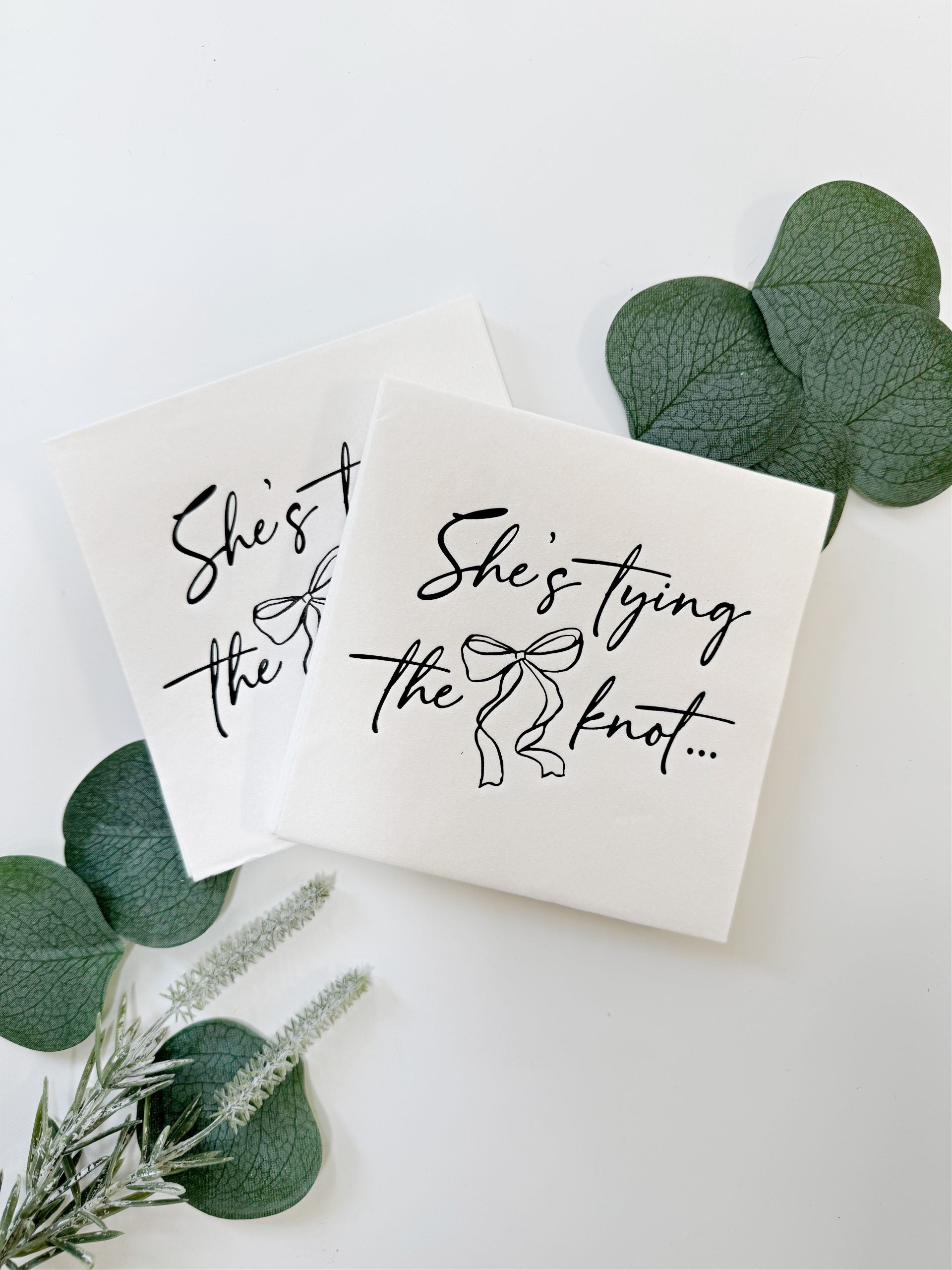 For a seamlessly coordinated ensemble, pair these cocktail napkins with our matching she's tying the knot frosted cups featuring the same stunning bow design. With our "She's Tying The Knot" Napkins, every detail of your bridal celebration will exude charm and elegance, ensuring a memorable and stylish occasion for all.