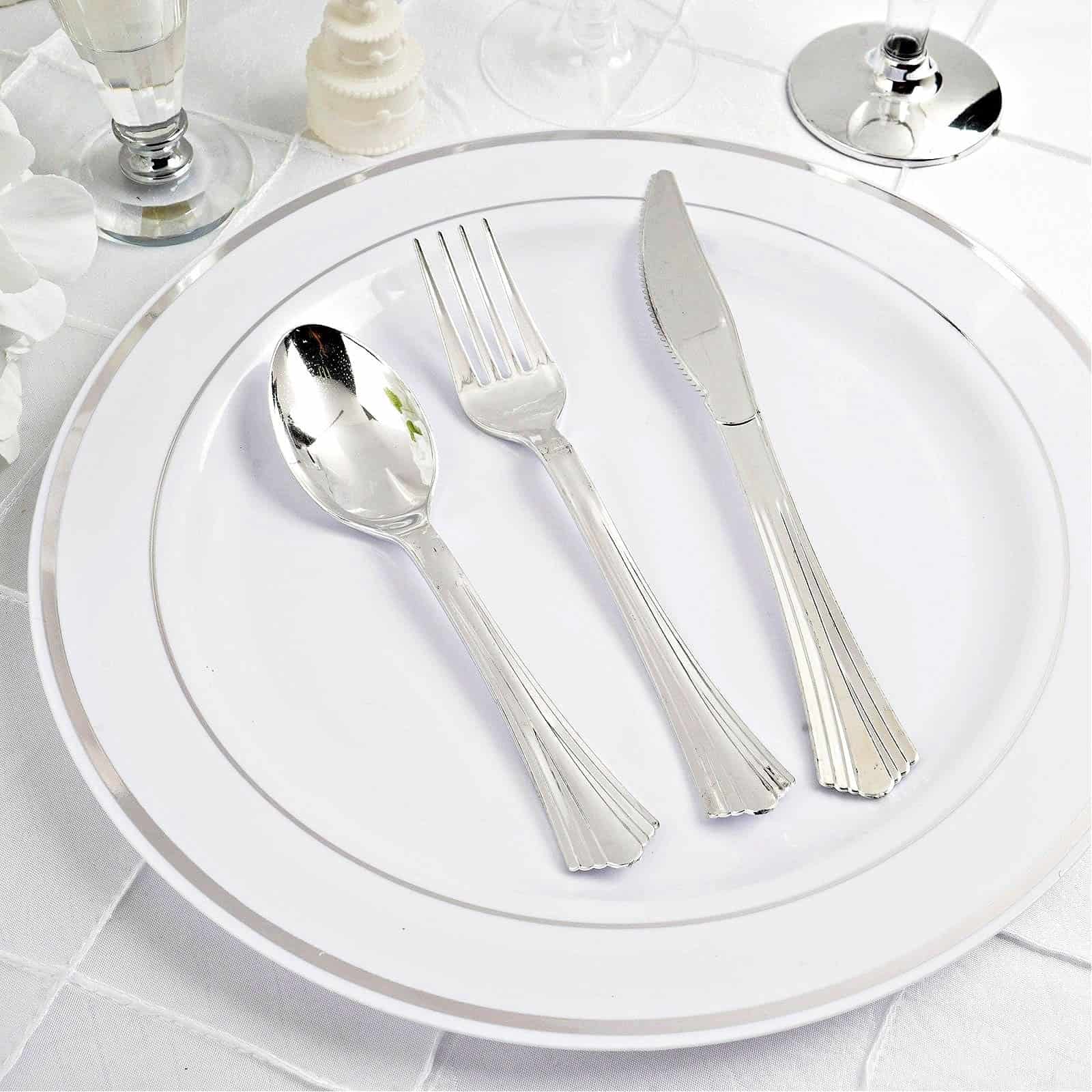 Create an elegant and sophisticated tablescape with our Silver Finish Plastic Flatware and Cutlery Sets; featuring premium quality heavy duty plastic forks, knives, and spoons. Our luxurious line of Silver Plastic Cutlery combines the convenience of disposability with the charismatic appeal of refined flatware. Make your cleanup time a cinch for any occasion with our eye-catching plastic flatware, dinnerware, and stemware collection. These glittering Cutlery Set are an ideal choice for cakes, side dishes, salads, cereals, desserts, appetizers, and more.