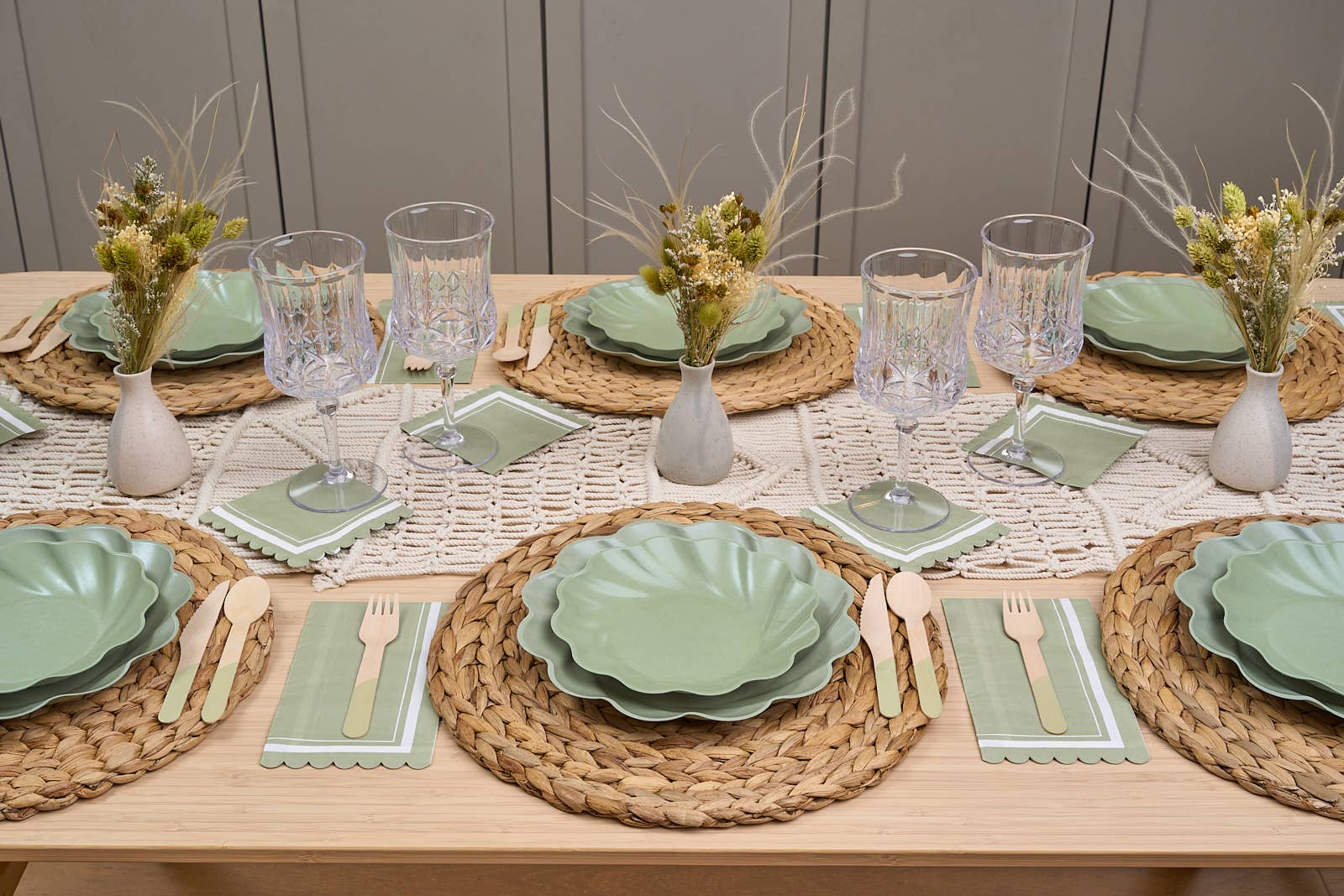 Introducing our Sage Bamboo Compostable Dinner Plates, a delightful collection of eco dinner plates in soft and charming colors. Made from a natural and compostable blend of bamboo, wood fiber, and sugarcane, these plates offer an eco-friendly alternative to our designer paper plates. With our Sage Dinner Plates, you can skip the dishes and help save the earth! (Dessert size is available separately.)