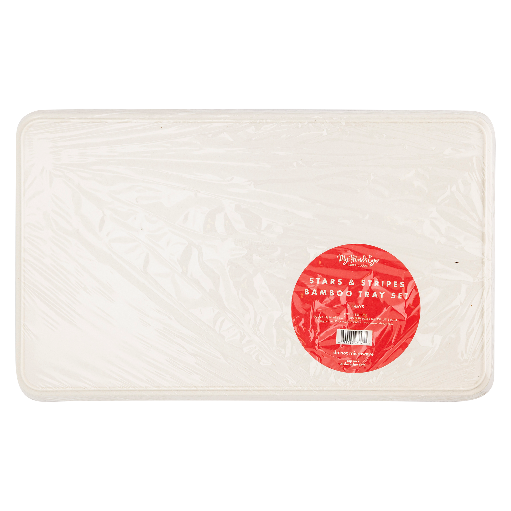This set includes two trays made from eco-friendly bamboo material. The star tray measures 8 inches, while the striped tray measures 17.25 by 10.5 inches, ensuring you have the perfect size for any serving need. Whether you're serving appetizers, snacks, or desserts, these trays offer a patriotic touch in a practical way.