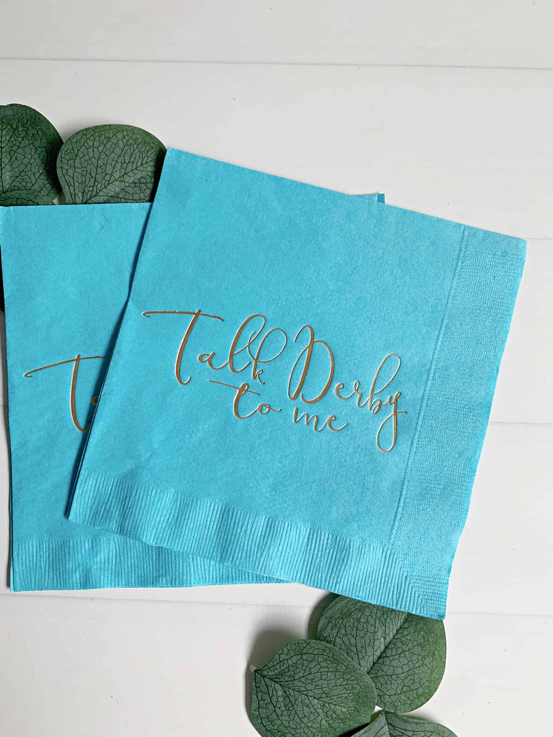 Throwing a Kentucky Derby party, garden party, tea party baby shower, bridal shower or other event? Then you'll probably need some adorable tableware. These napkins are a gorgeous turquoise with gold foil stamped "Talk Derby to Me"