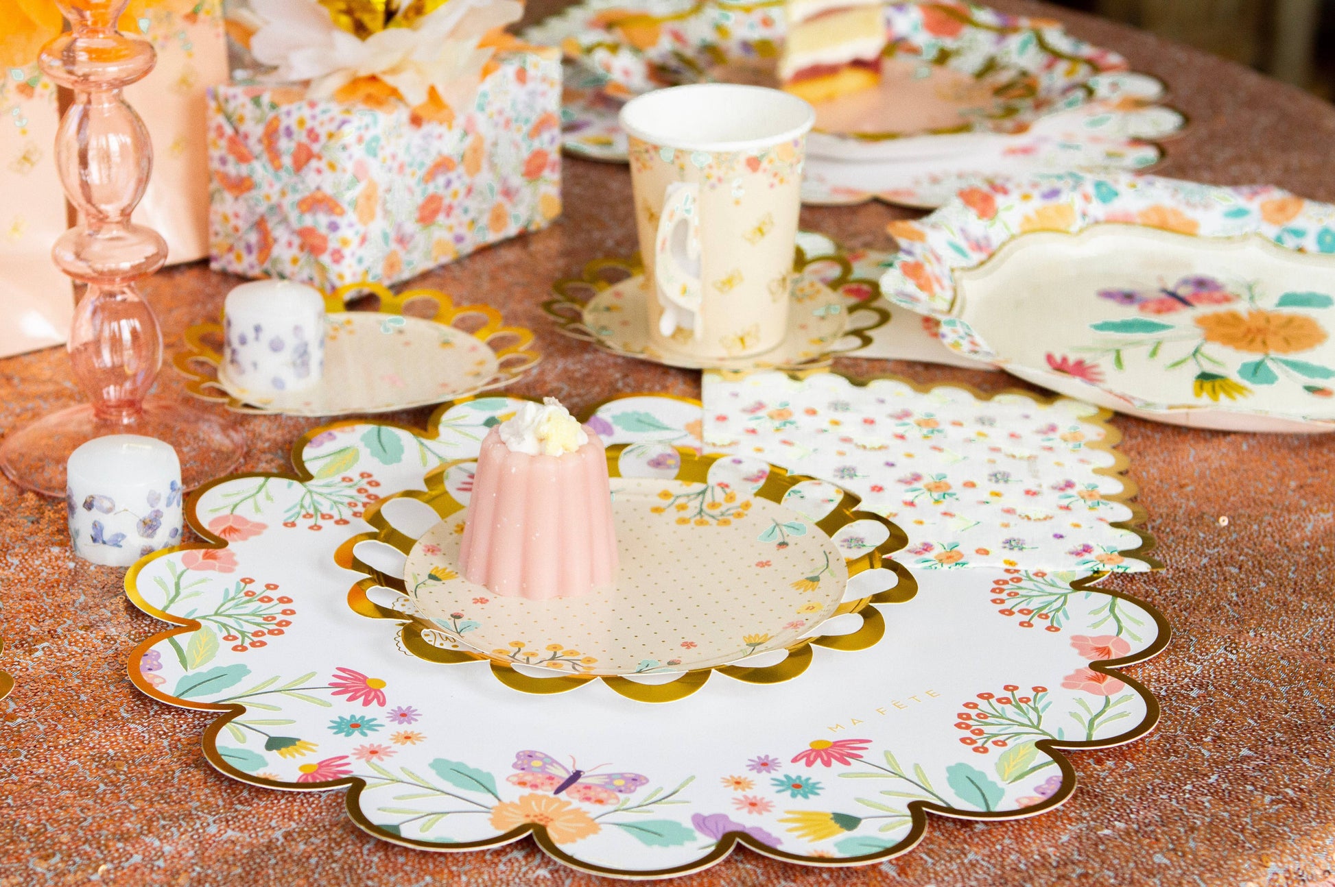 The placemats feature scalloped edges and charming gold foil details, elevating the beauty of the floral and butterfly design.