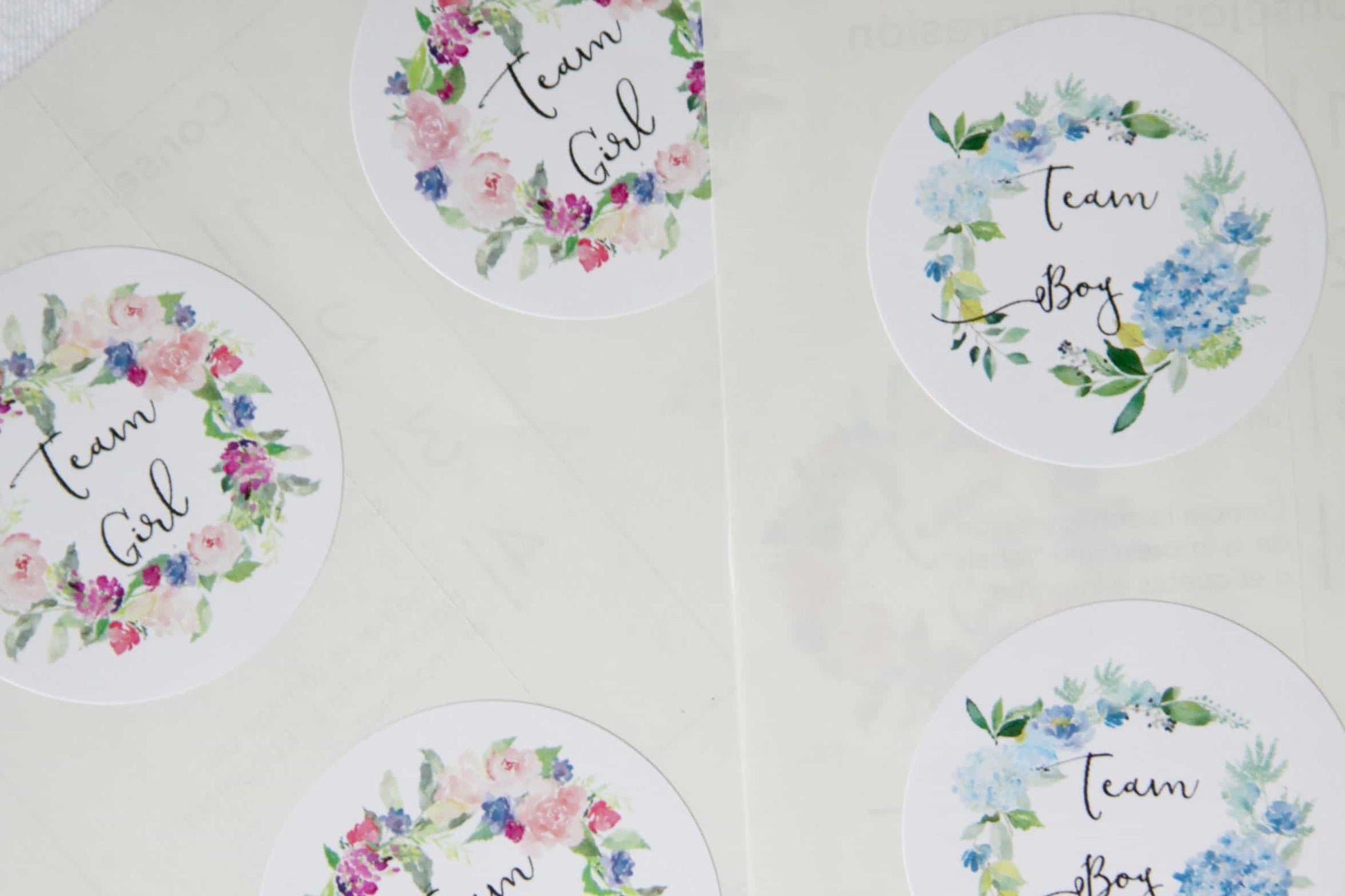 Team boy and team girl stickers are perfect for a gender reveal party or a baby shower! Invite your guests to make a baby gender prediction by choosing a sticker to wear or use at your gender reveal party! A fun gender reveal party game. Delicate watercolor flower wreaths in shades of pinks (Team Girl) or blues (Team Boy).