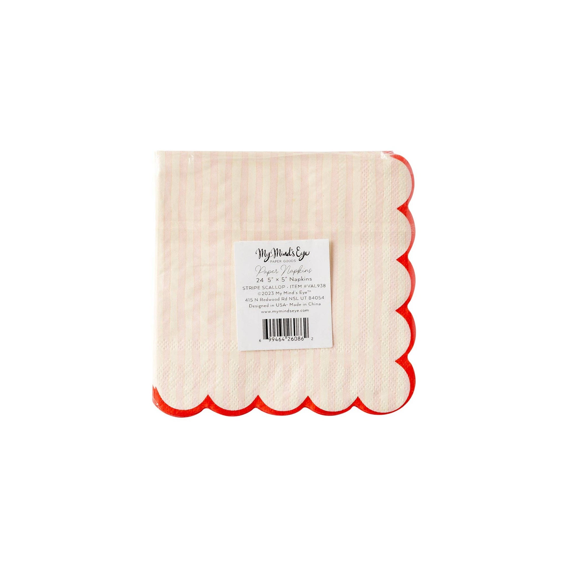 Party napkins are a must at any gathering, so ensure that you include pretty ones at your table. Featuring a scalloped edge and soft pink stripes accented with red, these cocktail napkins are a romantic addition to Valentine's Day parties, anniversary dinners, or engagement cocktail parties!