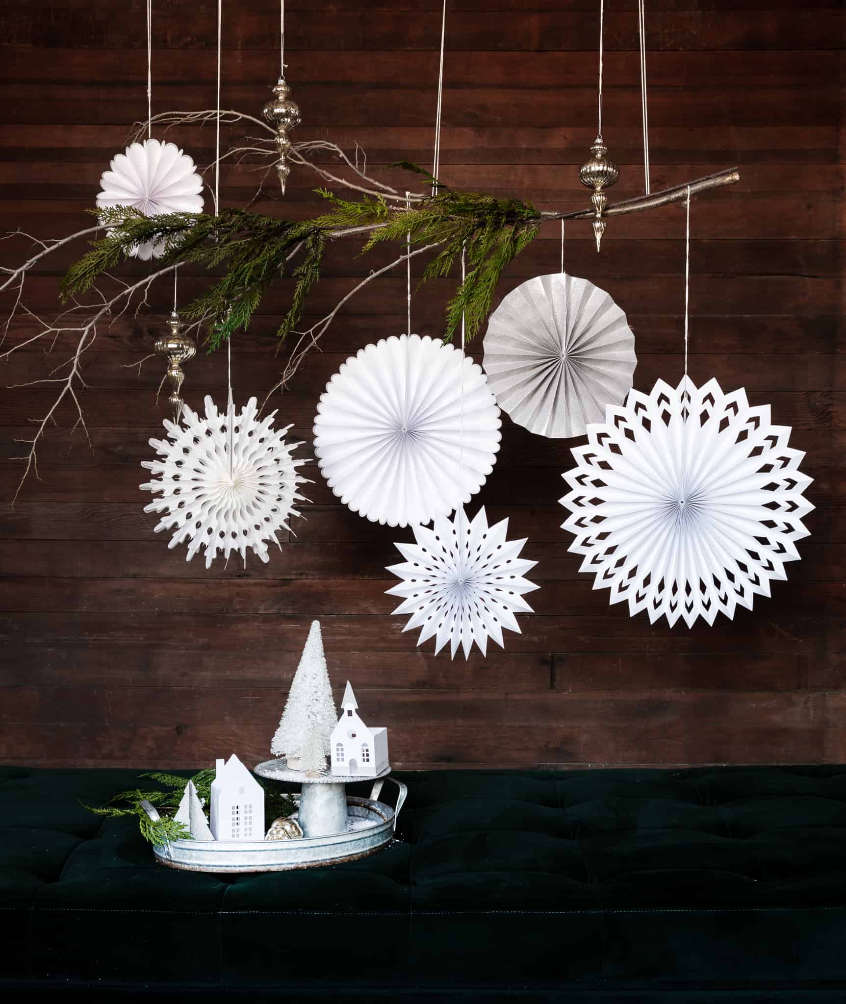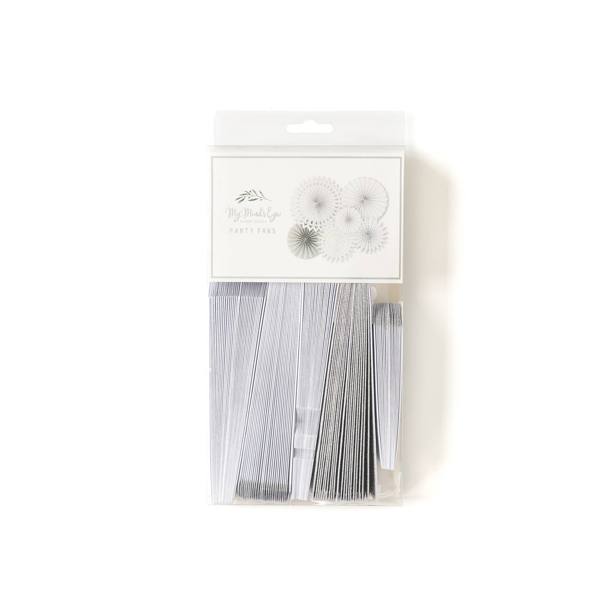 Baby, It's Cold Outside - snowflake and circular fans in shades of sparkly white and silver. Use for a winter baby shower, winter wedding, or New Year's Eve party.