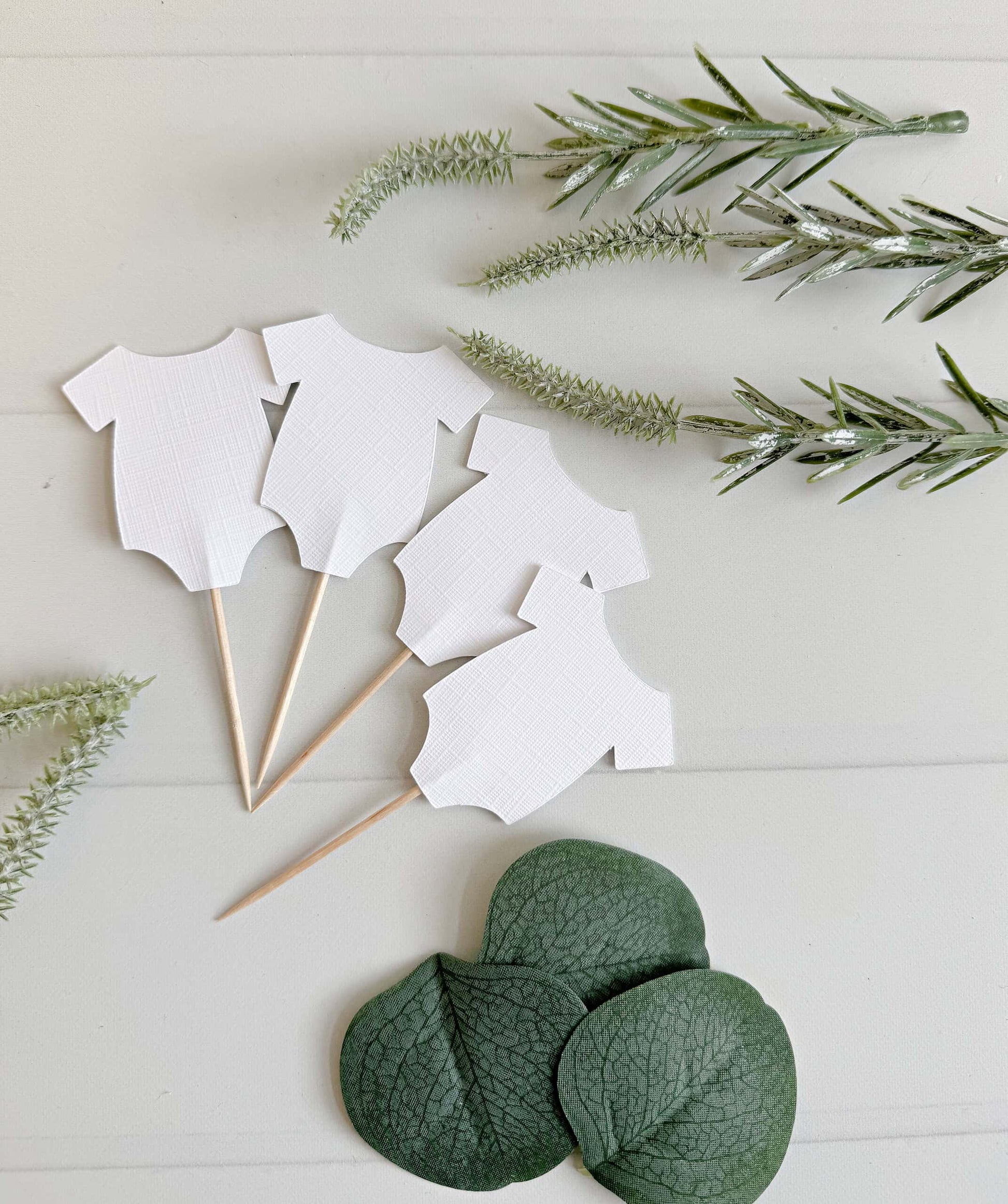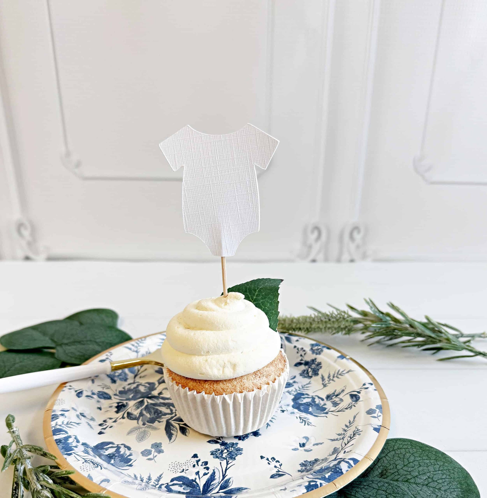 Enhance the charm of your gender reveal or baby shower cupcakes by adding these delightful textured white baby bodysuit toppers! Crafted to perfection, these cupcake picks are sure to captivate all your guests, guaranteeing that your cupcakes will be devoured within minutes!