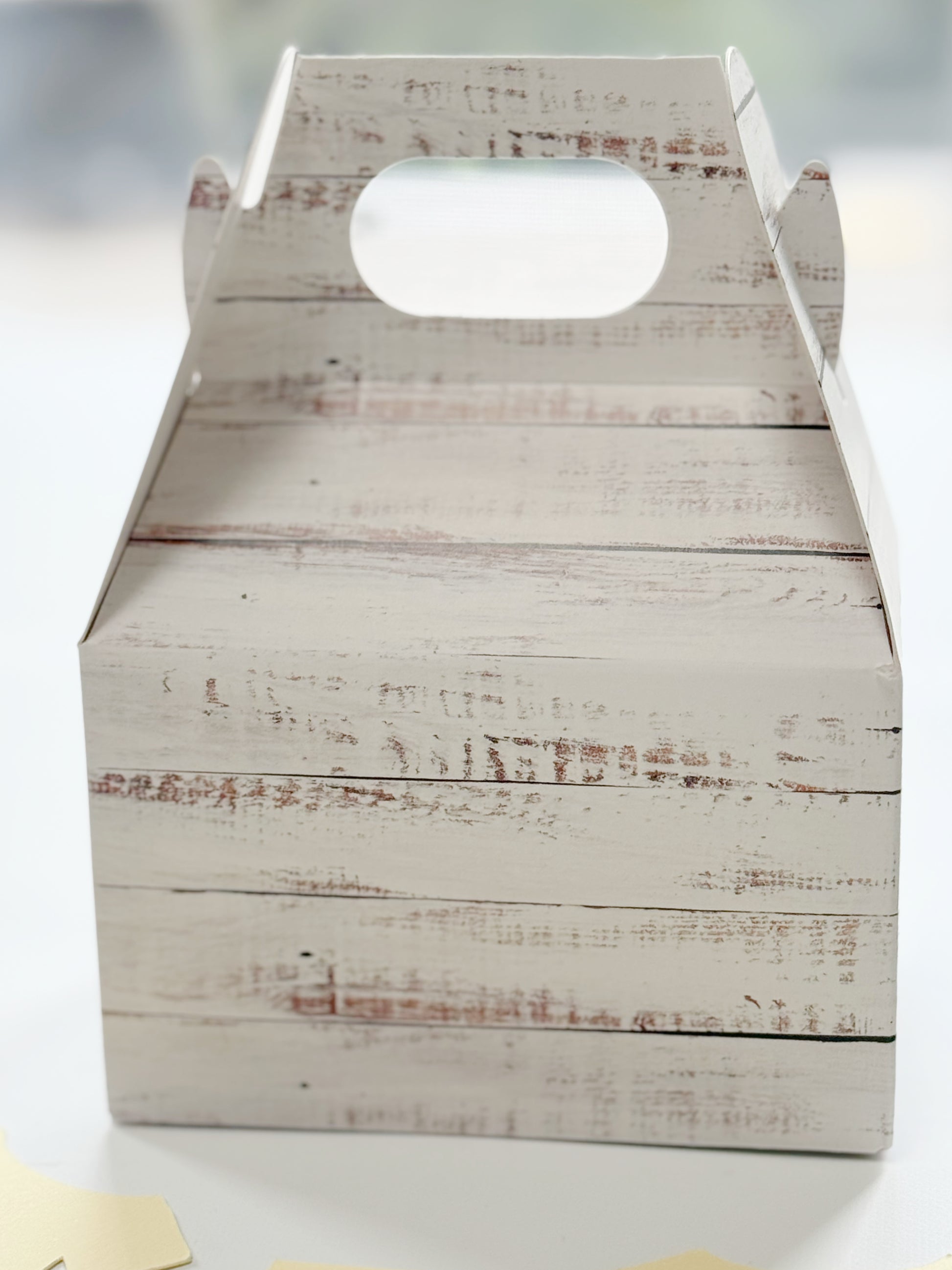 Distressed Woodgrain gable boxes feature an aged white washed wood panel design. The large gable boxes are great for boxed lunches, realtor gifts, wedding welcome boxes and gift sets. These boxes are packed flat and sold in small packs of 6. Use for weddings, bridal showers, baby showers, and birthdays. Use for wrapping holiday, Christmas and other presents. Perfect for Christmas and holiday gifts. Makes your lumberjack party or flannel, furs and fizz party complete!